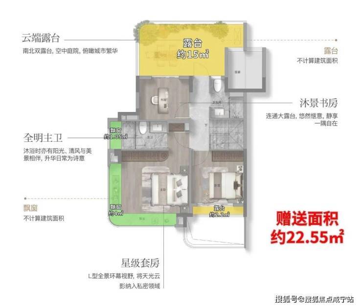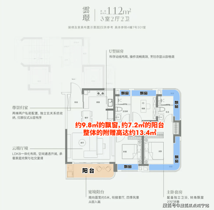 这个户型有约9.8㎡的飘窗,约7.2㎡的阳台,整体的附赠高达约13.4㎡。这是目前上海外环沿线,是附赠率最高的一个小高层产品。
