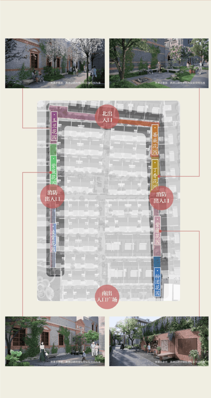 项目拥有约1.1的超低建筑容积率,社区狮子景观轴线串联海派生活的原味;提取经典洋房的场景植入社区景观打造,将丁香、紫藤,蔷薇,紫薇……等八种主题花卉,传香入园,串联巷弄8个花园,组成U型景观带,围合一座弘安大花园,叠影海派繁花巷弄里。