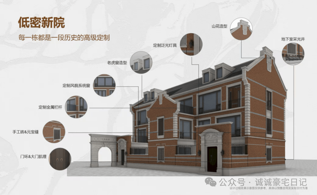 聚焦到风貌别墅本身,静安里应用8大定制级的产品设计手法,通过定制级手工砖、定制级山花造型、定制级铁艺栏杆、定制级入户壁灯、定制级的风帽雨水斗等部品部件,每一处细节都是匠心打磨的痕迹