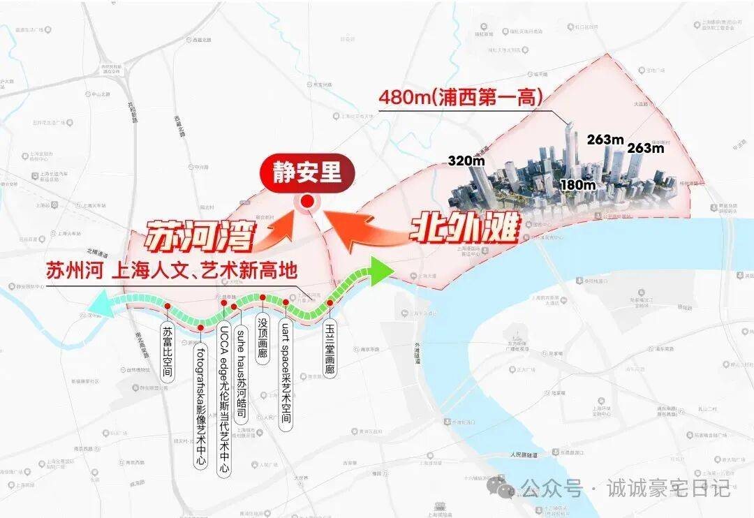 规划能级超群:北外滩开发体量超840万方(陆家嘴核心2倍),480米新地标领衔5栋300米+、13栋200米+摩天建筑群,打造浦西全新制高点